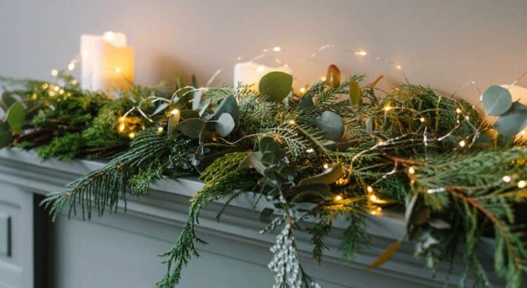 Imagine a garland that looks freshly gathered from a winter garden, full of texture and gentle movement. A lush mixed-green garland combines the glossy needles of fir, the dusty blue-gray of eucalyptus, and the structured sprays of cedar for a layered, botanical effect. When woven with warm white fairy lights and draped loosely across the mantel, it creates a living line that draws the eye without overpowering.